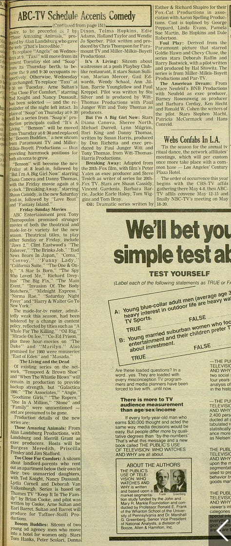 Little did anyone know that this sentence from the Variety coverage would give ABC a #1 show and cultural sensation just a few years later “Dramatic shows were not over-looked by the web, as it has made commitments to three such series ('Oil," "Foul Play” and “The American Dream"), which will go into production for airing sometime during the coming season - and represent the web's bench for backup utilization.” Oil was the original title of Dynasty.