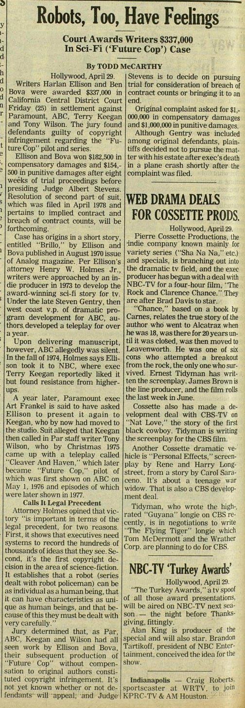 Future Cop was a failed and boring 1976 crime drama about two patrol officers played by Ernest Borgnine and an actor named Michael Shannon (not that one), but Shannon’s character was actually an android. You can watch the pilot below. More interesting than the series itself was the behind-the-scenes copyright drama. Two noted science fiction writers, Harlan Ellison and Ben Bova, sued ABC and Paramount, among others, claiming they created the show in 1973, and that executives at both of those companies read treatments and scripts. A jury agreed, and ultimately the writers received $337K, much lower than the $3M requested.