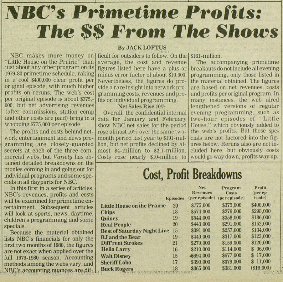 The above provides fascinating insight into the profit levels for hit TV series of the time, using NBC as a case study. Little House On The Prairie is in the spotlight today due to its success on SVOD and FAST and the upcoming Netflix reboot, which was just renewed for a second season before S1 has launched. In 1980, it was NBC’s most profitable program, earning $400K per episode ($1.55M today).
