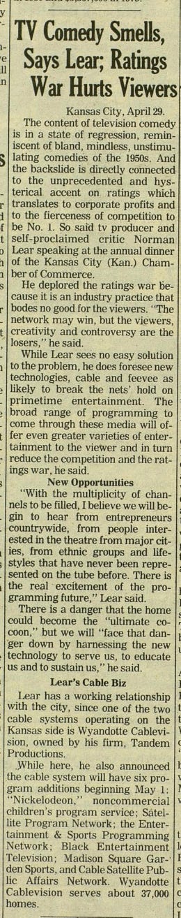 The TV section for this edition starts with an article about a prescient speech from Norman Lear given at the Kansas City Chamber of Commerce. He asserts that the networks’ obsession with ratings is leading to a decrease in show quality, specifically comedy, and states that “The network may win, but the viewers, creativity, and controversy are the losers.” He is wrong about that, and without those ratings, there is no one to fund the production of any programming. Additionally, I would point to All In The Family as the biggest proof that quality and the chase for ratings can go hand in hand.