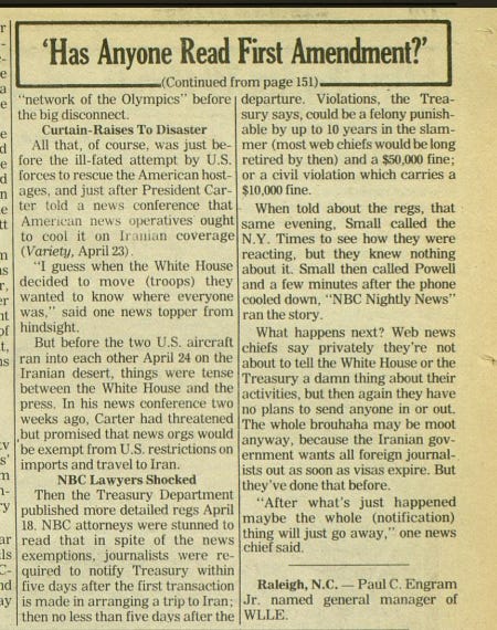 You might think the current tension between the government and the news media about Iran is something unusual, but it’s not. The second article of note above is called, Has Anyone At The White House Read the First Amendment? It recounts a testy phone call between the head of NBC News, Bill Small, and Jimmy Carter’s White House Press Secretary Jody Powell. Small was annoyed that The White House wanted news organizations to tell the government every time they moved people in or out of Iran because of the Iranian hostage crisis and the failed rescue attempt two weeks prior. Violations of the rule could lead to ten years in jail and/or a $50K fine. Powell said, “not even Nixon and his crowd ever tried to pull anything like this.”