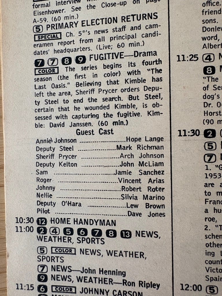 Many people associate the 1950’s with black and white TV and the 1960s as a decade of color programming. That is true to some degree but as we see here, as late as 1966 The Fugitive was still broadcasting in B&W and it wasn’t until the fourth season, in the Fall of that year, when it switched to color.