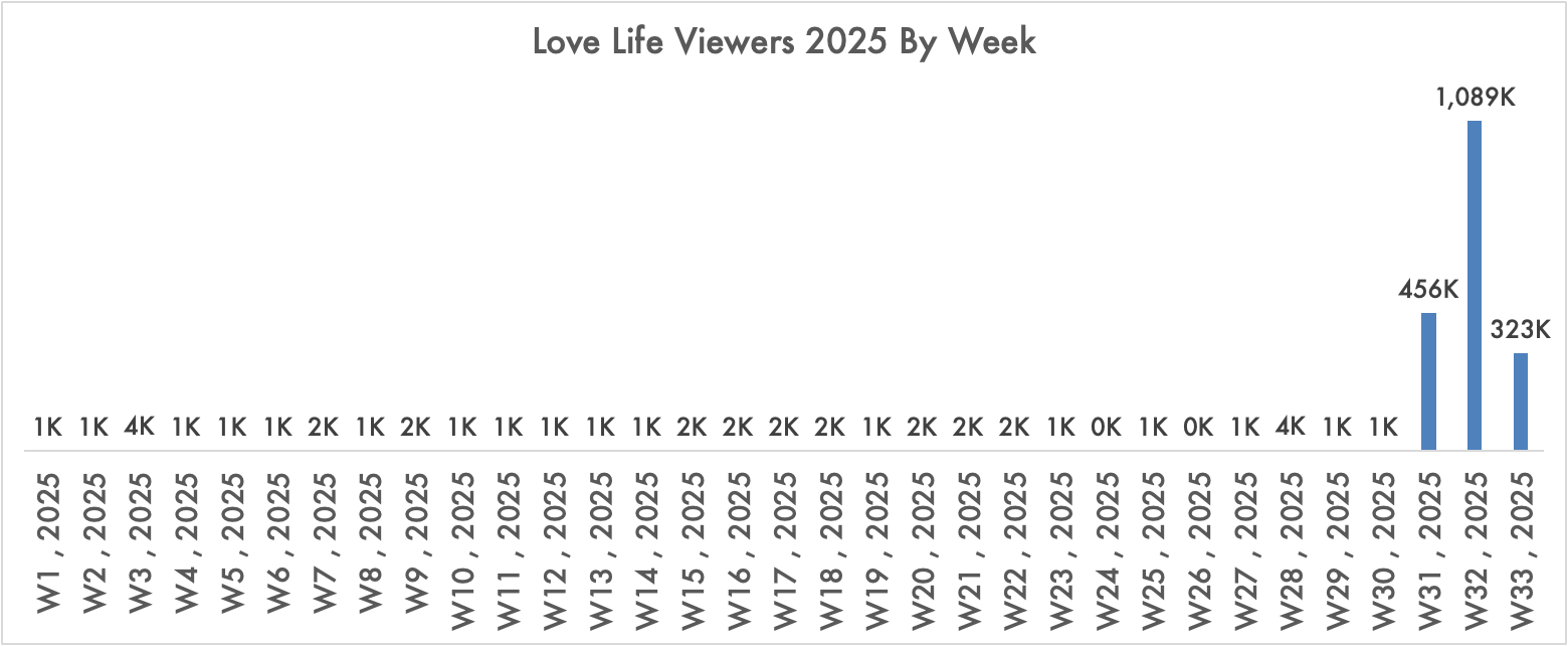 4) Netflix is likely the only buyer for such a show - it has already boosted viewing from 1K-2K per week on HBO Max to 1.1M views in the first full week as shown below. Love Life debuted on Netflix on 8/5/25, in week 31. The show has already declined drastically after a week two peak either because it is so short or there is no long tail interest, or both. It is hard to imagine any other streamer or a cable network or a local station being inspired by this data.