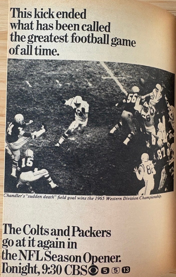 This ad for the official start of the NFL’s 1966/67 season is historically important because the first Super Bowl was played at the end of this season, on 1/15/67. Note that both NBC and CBS carried the first “big game”.