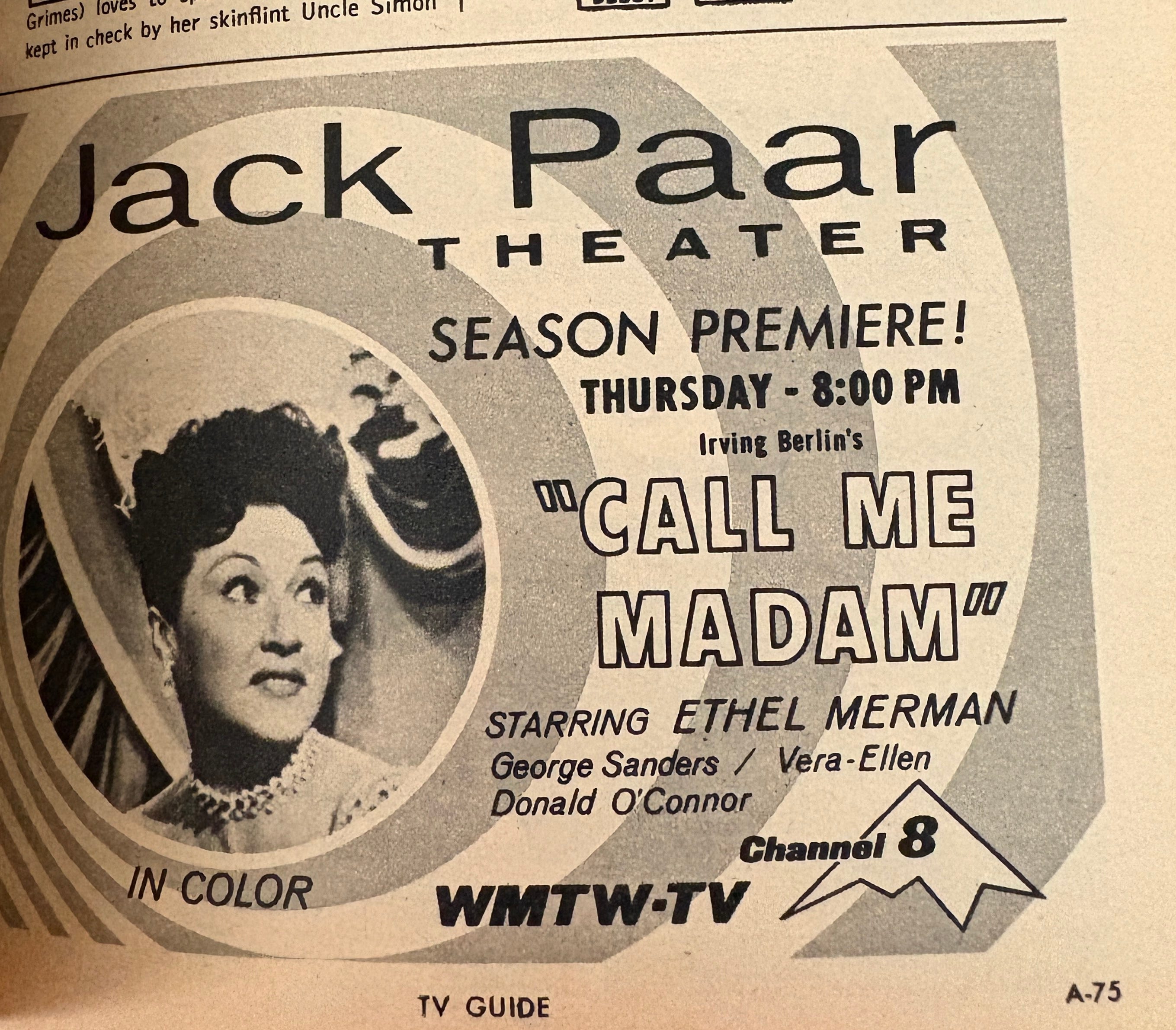Jack Paar was the second host of The Tonight show between Steve Allen and Johnny Carson but I was confused when I saw this ad. Why is there a Jack Paar branded movie on a local TV station? Turns out this TV Guide is for Northern New England and in 1963 Paar bought WMTW in Portland Maine and owned it until 1967 so he apparently hosted and/or programmed his own movie slot during that time.