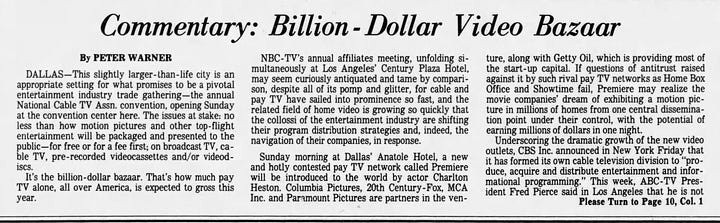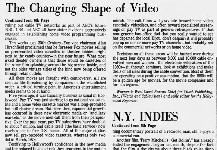 This 1980 article describes a hot time in the TV world at the turn of the decade with 1) a meeting of the National Cable TV Association to discuss burgeoning cable business models 2) the NBC affiliates meeting seeming “curiously antiquated and tame by comparison”, 3) CBS announcing it had formed a cable television division 4) ABC saying that it might too 5) all three networks exploring home video divisions, and 6) 20th saying it could see home videotapes being sold right in movie theater lobbies - of the same films playing there at the time.
