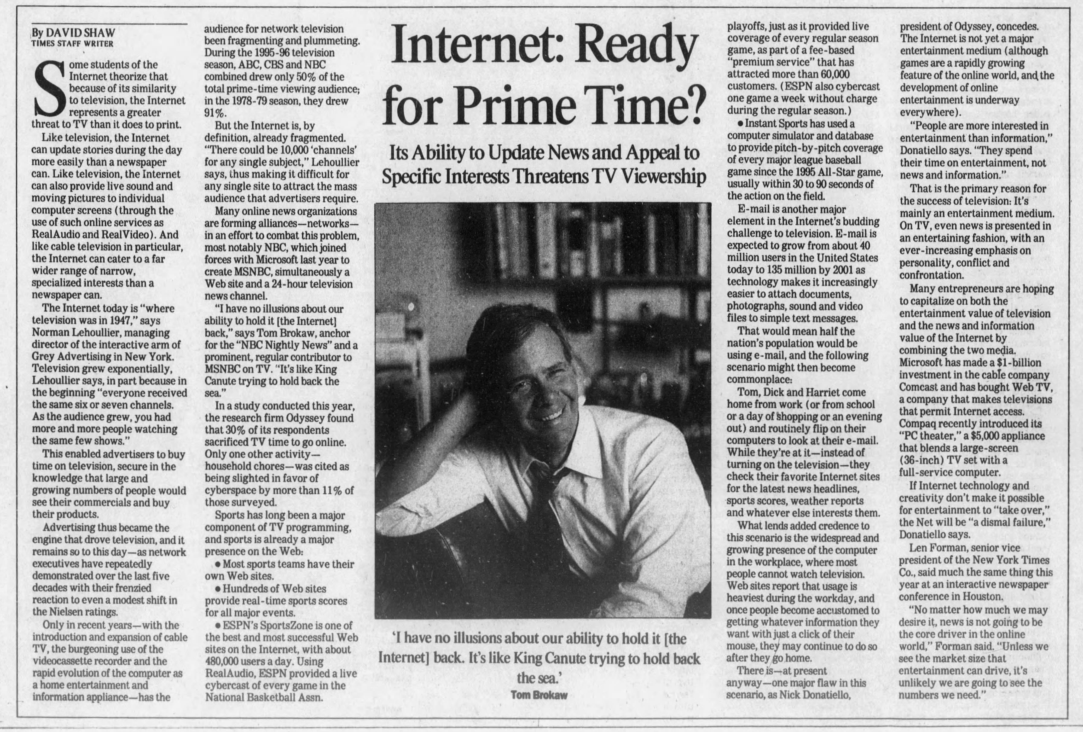 The article does have the foresight to predict this scenario: Tom, Dick and Harriet come home from work (or from school or a day of shopping or an evening out) and routinely flip on their computers to look at their email. While they’re at it - instead of turning on the television - they check their favorite internet sites for the latest news headlines, sports scores, weather reports and whatever else interests them.”